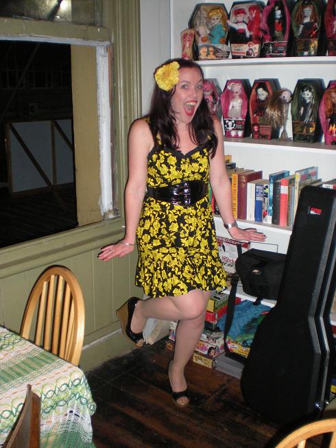 My Saturday evening dress was also with a yellow theme. Black with yellow roses. Accessorised with a yellow flower. This dress was bought from an incredible store in Fitzroy- Melbourne. (We think the store was called "Lost and found") This store was the best example of chaos I have ever seen. The whole thing was the size of a warehouse with split levels all over the place. Unlike other 2nd hand/ curious type shops I have been into- this one had absolutely no rhyme or reason to where everything was. There was no clothing section. No furniture section. No record section. Everything was just kinda mushed together. It made for an interesting experience trawling through it. While it didn't appeal to my OCD tendencies- I did really like the surprise element of looking through everything and not knowing what you were going to find. We were there for about 45 minutes I guess- and I bought this dress as well as an awesome retro Casio Keyboard. Still in the box even!
