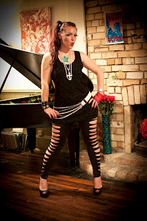 These incredible slashed shiny leggings came from her. Now the only thing to ponder was what on EARTH was I going to wear with them? I checked all the local op shops and second hand stores. Nothing. (Always the way when you are looking for something specific I find) I was about to give up hope completely when I hit the jackpot. Valley Girl of all places. The sale racks there were bulging with long tops and short dresses in lace, tie dye, slashed lycra... I seriously found the motherload. The one I decided to roll with is a black lace singlet short dress with full length zip down the back and side pieces cut out.